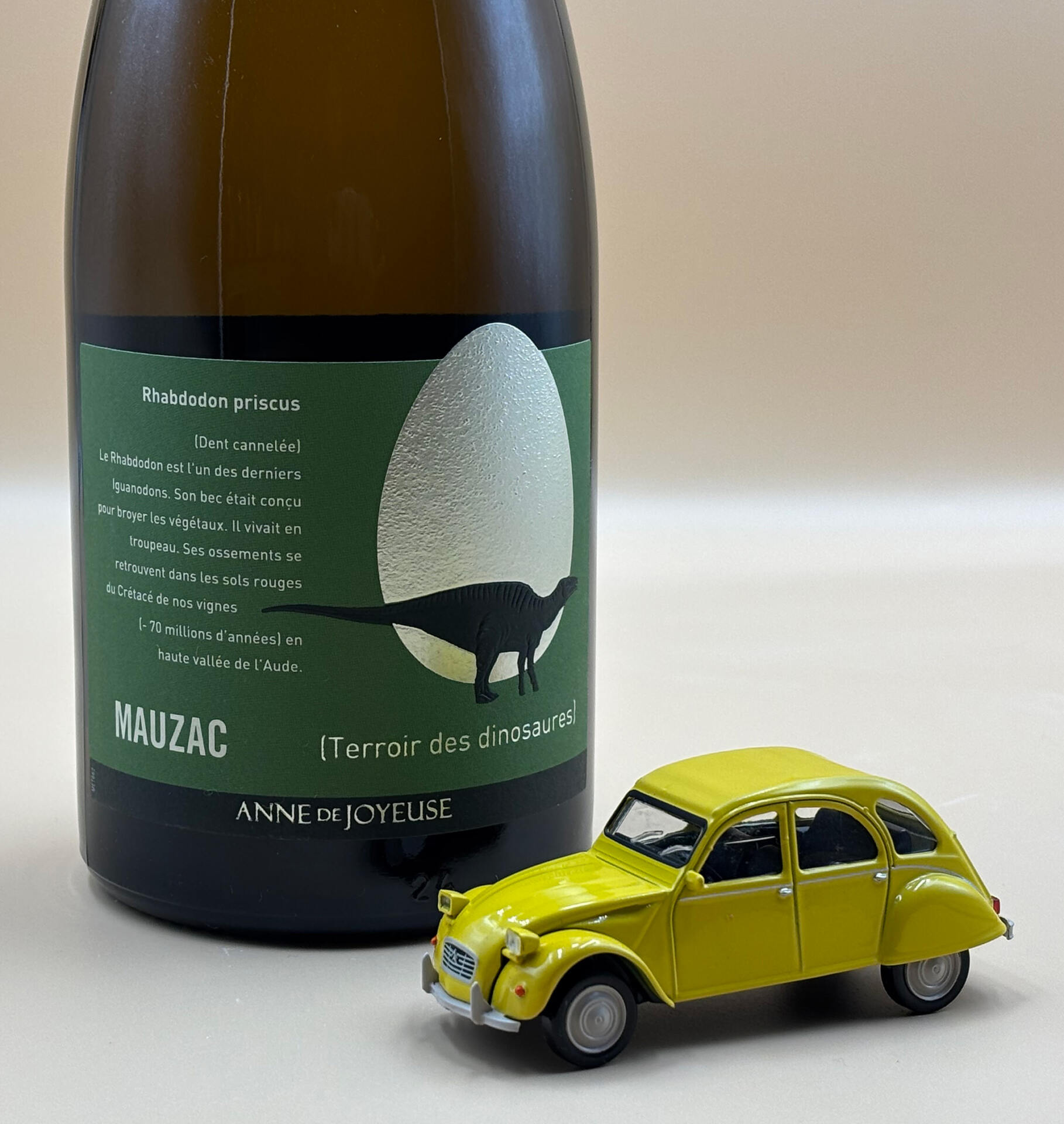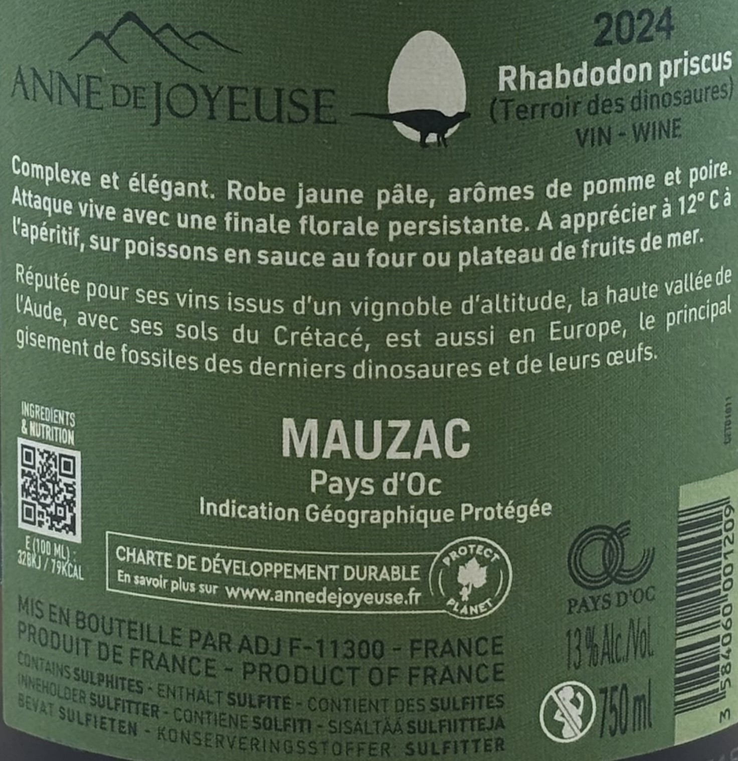 Detta vita vin kommer från Pays d’Oc i södra Frankrike och är producerat av Anne de Joyeuse. Vinet ingår i serien Terroir des dinosaures, som syftar på den högt belägna delen av Aude där vingårdarna ligger på gamla jordar från kritperioden i ett område som också är känt för fynd av dinosauriefossil. Det är ett vin med både regional karaktär och friskhet från de svalare höjderna.