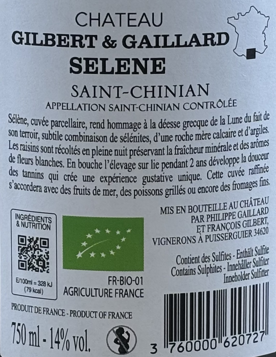Detta vita vin kommer från Saint-Chinian i Languedoc i södra Frankrike, ett område känt för karaktärsfulla viner med både friskhet och djup. Vinet är producerat av Château Gilbert & Gaillard och cuvéen Sélène är ett parcelurval som hyllar den grekiska mångudinnan Selene. Enligt etiketten kommer vinets särprägel från ett terroir med en fin kombination av selenit, kalkhaltig moderberggrund och lera. Druvorna skördas nattetid för att bevara den mineraliska friskheten och de blommiga aromerna. Vinet är ekologiskt certifierat.