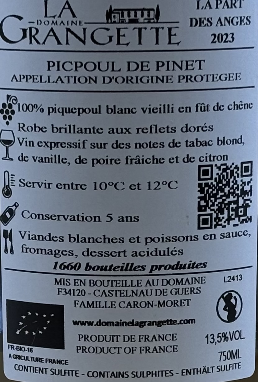 Detta vita vin kommer från Picpoul de Pinet i Languedoc i södra Frankrike och är producerat av Domaine La Grangette. Vinet är gjort på 100% Piquepoul Blanc och har lagrats på ekfat, vilket ger en fylligare och mer komplex stil än klassisk, helt frisk Picpoul. Vinet är ekologiskt certifierat, och enligt etiketten har 1660 flaskor producerats.