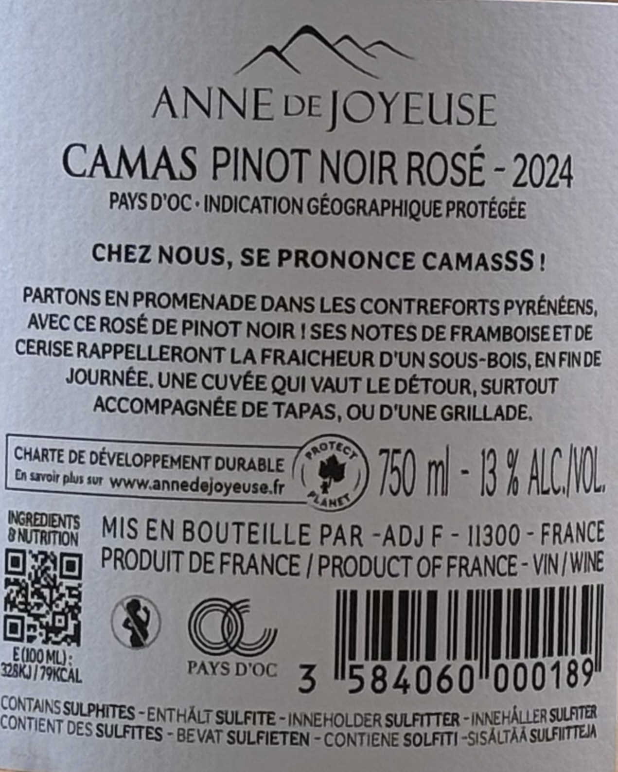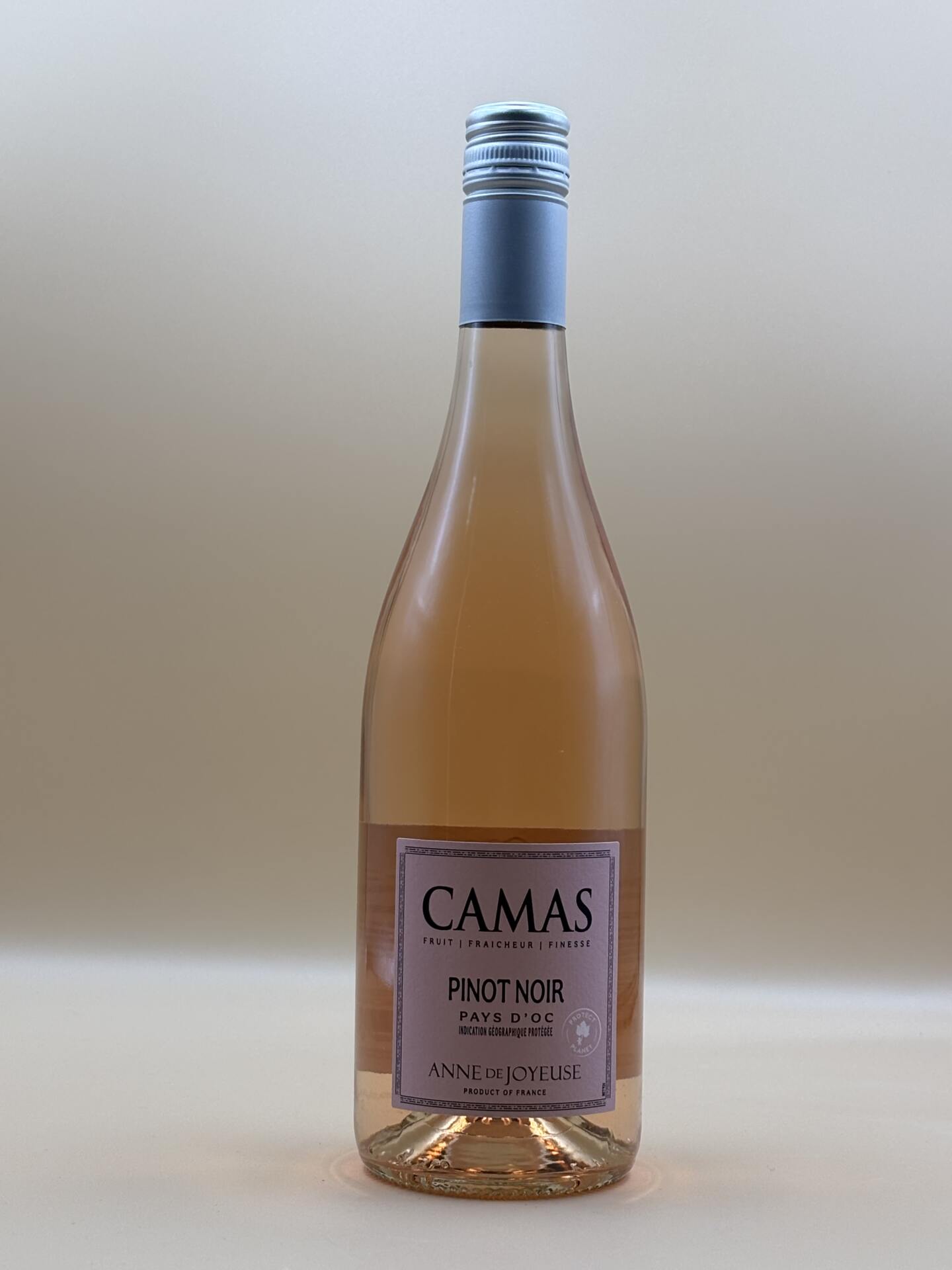 Denne rosévin kommer fra Pays d’Oc i Sydfrankrig og er produceret af Anne de Joyeuse, som er kendt for moderne, friske og lettilgængelige vine med tydeligt fransk præg. Camas-serien er skabt med fokus på frugt, friskhed og finesse, og denne rosé på Pinot Noir er lavet i en elegant og charmerende stil, som passer perfekt til lette retter og hyggelige stunder.
