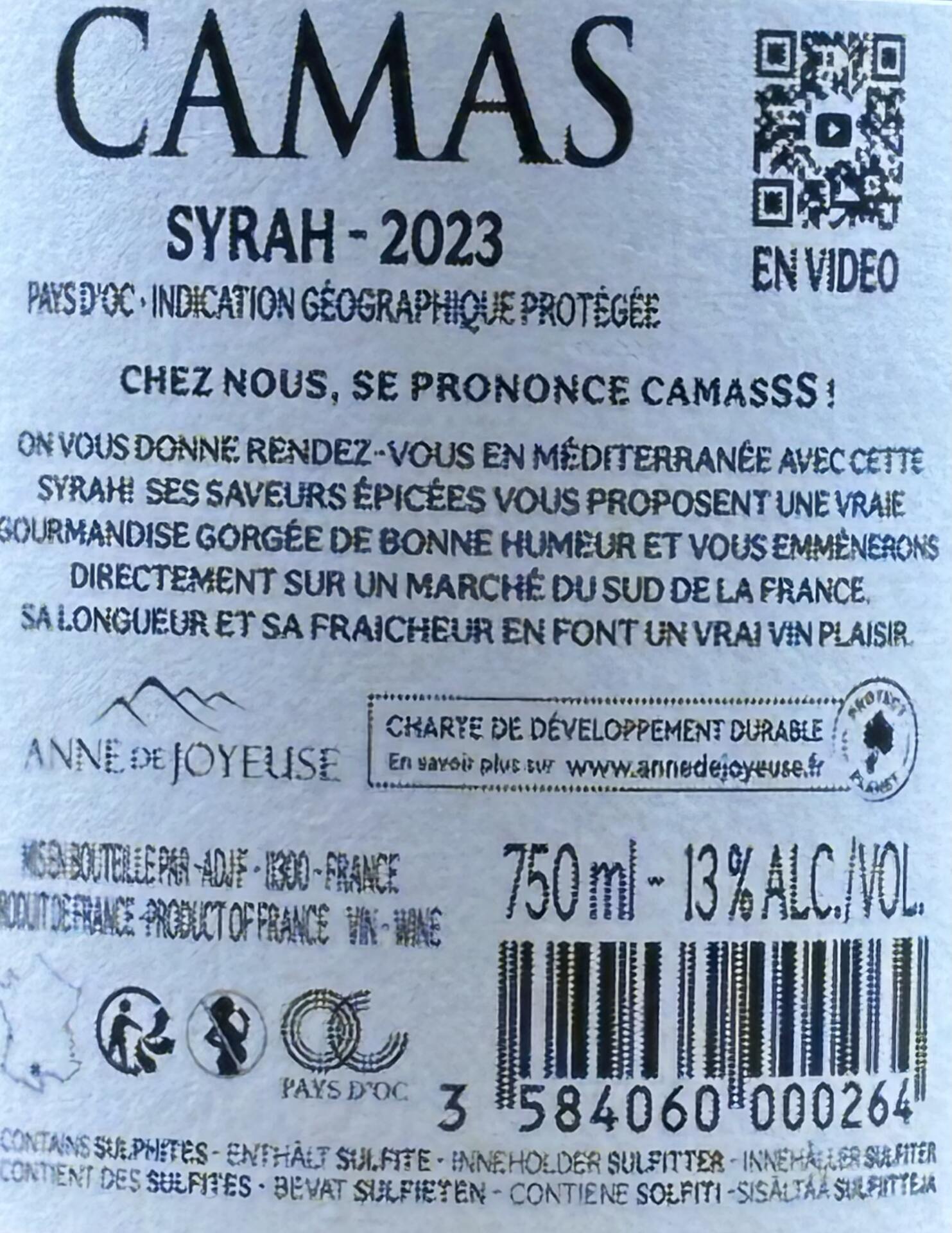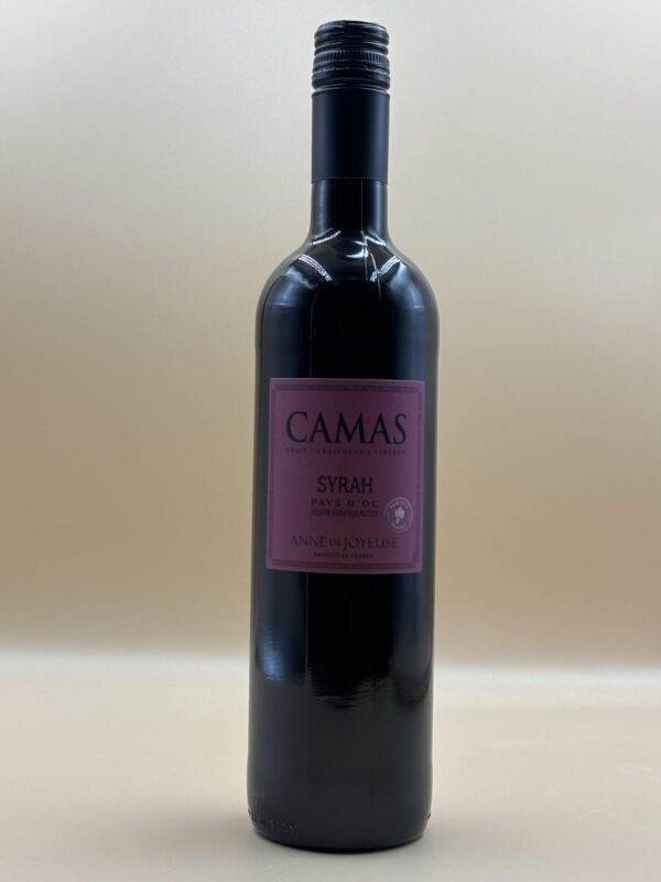 Denne rødvin kommer fra Pays d’Oc i Sydfrankrig og er produceret af Anne de Joyeuse. Camas-serien er kendt for vine med tydelig druekarakter, friskhed og finesse, og denne Syrah er skabt i en generøs og solmoden stil med inspiration fra Middelhavet. Vinen fremstår som en klassisk sydfransk hverdagsluksus med masser af frugt og charme.