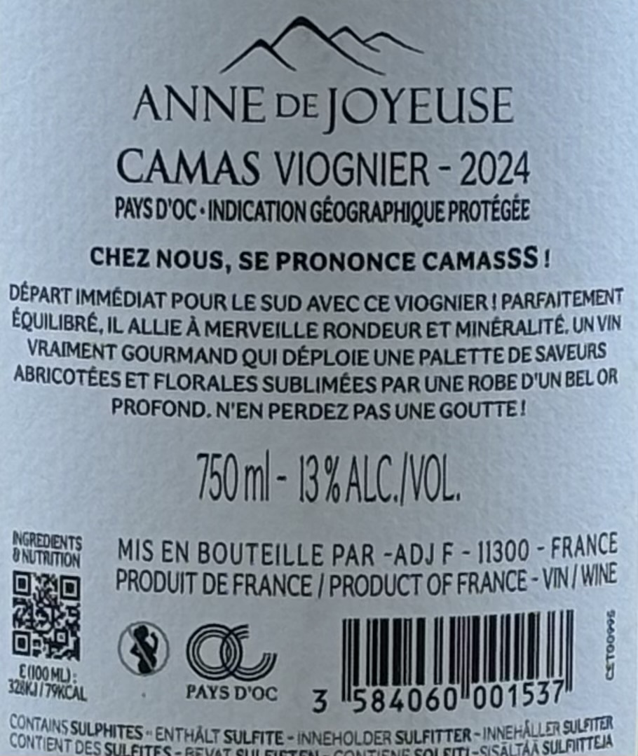 Denne vin kommer fra Pays d’Oc i det sydlige Frankrig og er produceret af Anne de Joyeuse. Området er kendt for sit varme klima, som giver modne og aromatiske hvidvine med generøs frugt og blød fylde. Camas Viognier er en karakterfuld hvidvin med både rundhed, friskhed og mineralsk balance.