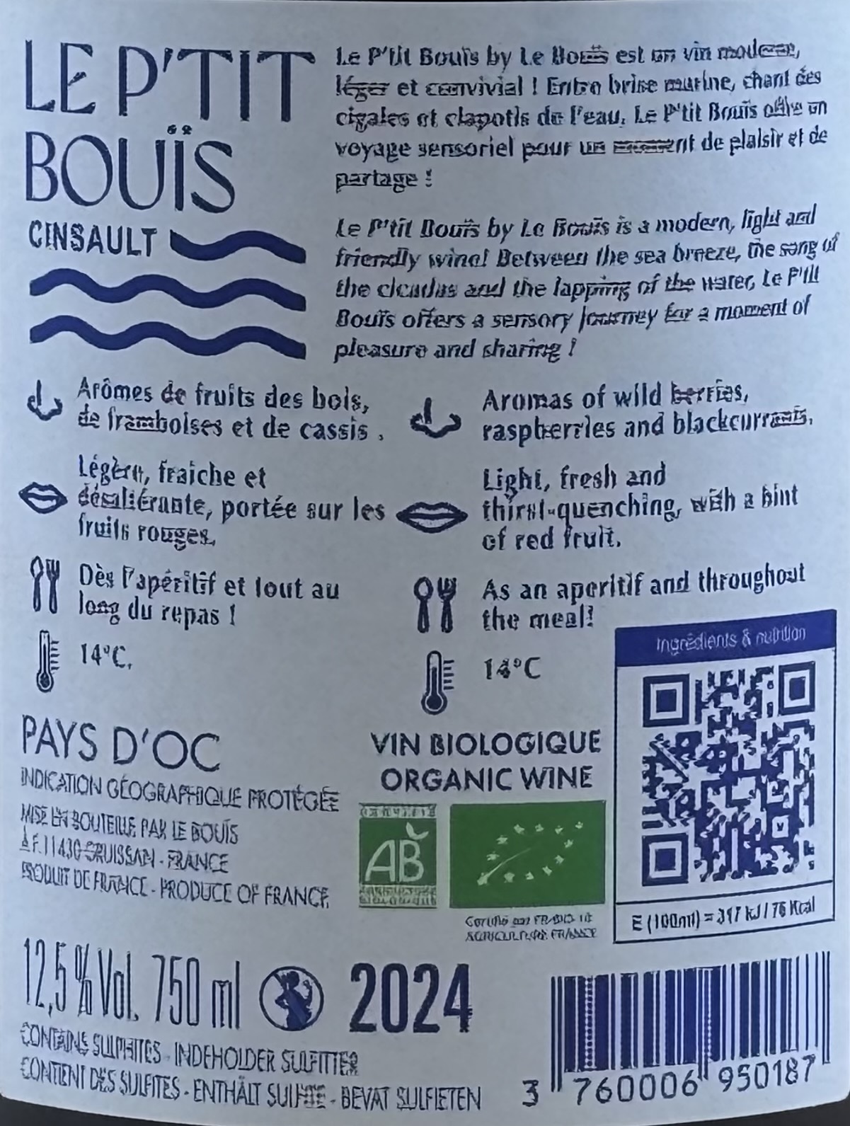 Denne vin kommer fra Pays d’Oc i Sydfrankrig og er produceret af Le Bouïs i Gruissan. Vinen er økologisk og lavet i en moderne, let og imødekommende stil, som passer godt til uformelle stunder og mad, der ikke skal overdøve vinen. Den afspejler det sydfranske klima med masser af friskhed, saftig frugt og en letdrikkelig karakter.