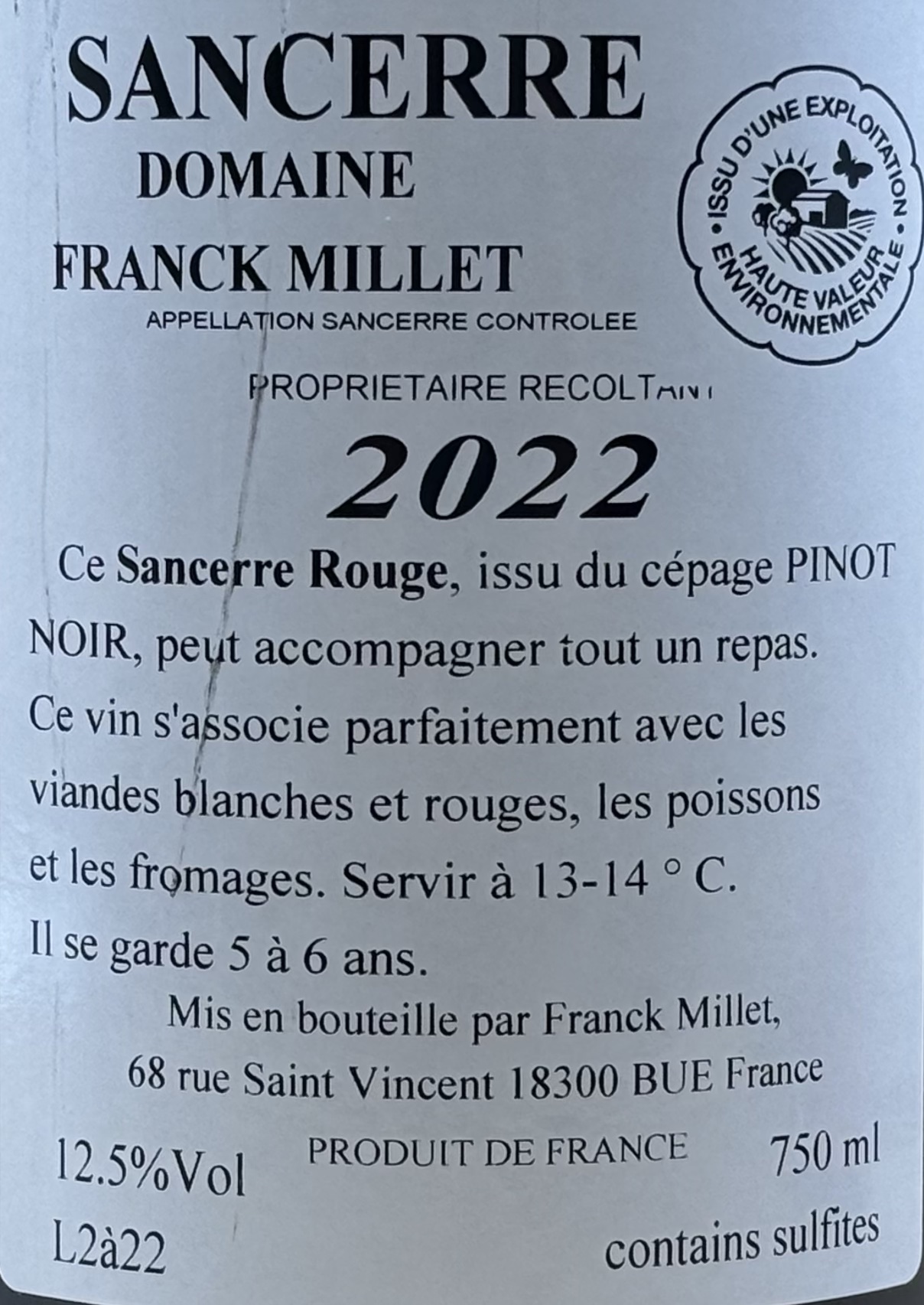 Denne rødvin kommer fra Sancerre i Loire-dalen i Frankrig og er produceret af Domaine Franck Millet i Bué, en af de klassiske vinlandsbyer i appellationen. Sancerre er mest kendt for sine hvide vine, men området laver også elegante og terroirprægede rødvine på Pinot Noir med friskhed, finesse og flot madvenlighed.