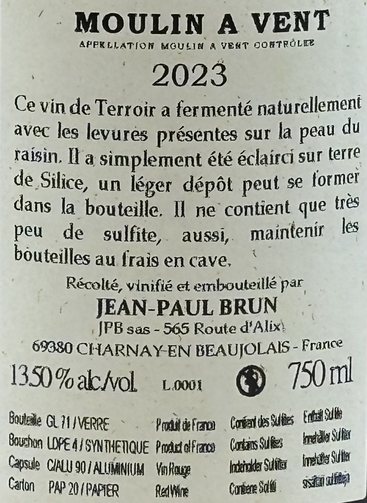Denne vin kommer fra Moulin-à-Vent i Beaujolais i Frankrig og er produceret af Jean-Paul Brun. Vinen bærer appellationen Moulin-à-Vent Contrôlée, som regnes blandt de mest seriøse og strukturerede cru’er i Beaujolais. Her får man en vin med mere dybde, kraft og lagringspotentiale end den lette, klassiske Beaujolais-stil.